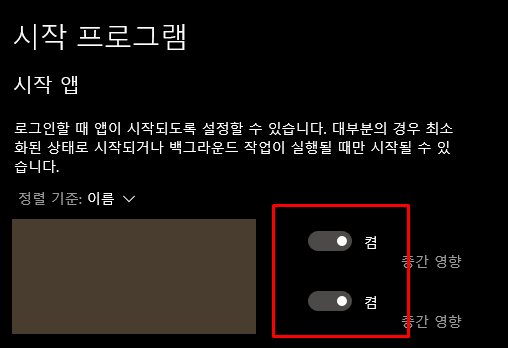 - 설정 앱 > 앱 > 시작 프로그램
